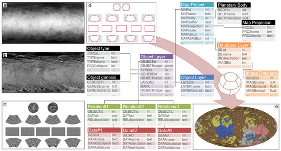 Different datasets serving as basis for developing the prototype. (a) Ceres Dawn FC2 HAMO global DTM, (b) Ceres Dawn FC2 HAMO global mosaic, (c) schema for HAMO map quadrangle, (d) quadrangle for geological maps, and (e) unified global map dataset of Ceres geology (references are indicated in the text below; coloured data tables describe the data model for the GIS-related data merge and linked to [63,64,65]).