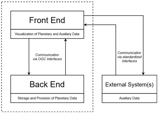 Based on the user and system requirements, we decided that a two-tier architecture with a data backend and a visualisation frontend met our needs (Figure 3) [72]. In our case, the task of the backend is the storage and provision of planetary data. The backend was designed to be deployed on a server. The frontend, however, represents the system’s interface to the user. It displays the planetary data provided by the backend. Thus, the frontend serves as the backend’s client.