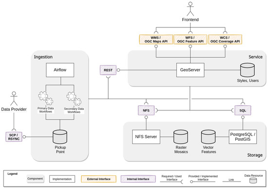 The service component provides interfaces to retrieve and visualise project datasets. The public interfaces are provided by GeoServer [41], which supports most of the OGC Standards and is widely used in the GIS community. The prototype backend currently provides OGC WMS, WCS, and WFS interfaces to the frontend and an administrative REST interface for the ingestion component.
