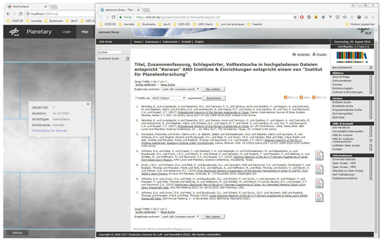 With all this in mind, the aim of this contribution was to demonstrate a solution for the structured management and visualisation of heterogeneous planetary research data compiled and developed with the contribution of the Institute for Planetary Research (PF) at the German Aerospace Center (DLR). This institute is involved in several international planetary missions and consequently produces and handles a large volume of different research data that can be distinguished into referenced, referenceable, or non-referenced research data (see Section 3.1 for more details). Since the primary research data are available through data archives and other platforms, this paper focused on the management of the secondary research data, incorporating scientific publications themselves as a research dataset. In order to manage these heterogeneous research data, an individual system environment has to be defined where different user groups should be able to store and query research data across multiple missions, planetary bodies, and scientific disciplines. Here, the spatial reference in combination with structured metadata should serve as the primary descriptive parameters on the top level. In order to benefit from existing open-source developments inside and outside of DLR, this contribution is proposed jointly by PF and the German Remote Sensing Data Center (DFD) at DLR. With its background in software development, DFD is involved in the reception, management, processing, provision, and analysis of German and European remote sensing data [45]. Finally, the paper had two essential foci: (1) to create a concept for the different scientific disciplines in the field of planetary research, in which the heterogeneous secondary research data are managed and made available in a reusable way via the spatial reference (directly or indirectly); (2) to implement this concept in a manner as resource-saving as possible. Thus, the choice fell on the existing system chain presented here. Although our development is based on GIS technology, we rather consider it as a data management system than a typical GIS.