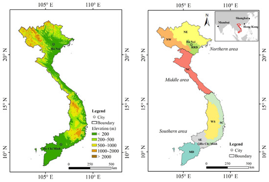 Vietnam is located in the eastern part of the China–Indochina Peninsula (8°10′–23°24′ N, 102°09′–109°30′ E), bordering Guangxi and Yunnan, China, in the north, and Laos and Cambodia in the west, with a long and narrow land area of approximately 33 × 104 km2 (Figure 1). The region has a tropical monsoon climate with high temperatures and rainfall, with an average annual temperature of approximately 24 °C and an average annual rainfall of 1500–2000 mm. In the north, there are four seasons: spring, summer, autumn and winter; in the south, there are two distinct rainy and dry seasons, with most areas having a rainy season from May to October and a dry season from November to April.