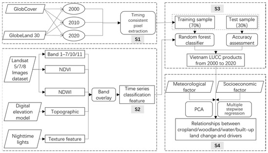 To address the key issues of the lack of national-scale, high-precision, automated spatio-temporal continuous land use/cover data sets, and the scarcity of studies on the driving mechanisms of land use change in Vietnam, this study used the GEE platform, based on Landsat satellite imagery and several other important auxiliary data. We applied “multi-source consistency” and “time-series stability” and RF methods to generate a high-precision land use/cover data product in Vietnam during the period 2000–2020. The technical route and modeling approach adopted in this paper are important references for similar studies to be conducted in other regions in the future.