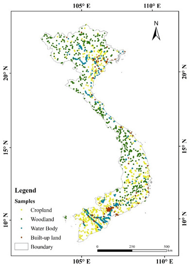 Automated satellite remote sensing supervised classification usually requires a certain number of model training samples and validation samples. Traditional studies generally use manual visual interpretation to obtain training and validation sample points. However, for a large geographical unit such as Vietnam, it is very difficult to obtain enough samples by manual visual interpretation, which will cost a large amount of labor and time, and cannot achieve the purpose of automated and fast mapping. In order to solve the above problems, this study implemented a highly reliable and automated method for training and validation sample point selection and attribute extraction based on the principles of “multi-source consistency” and “time-series stability” [15,29].