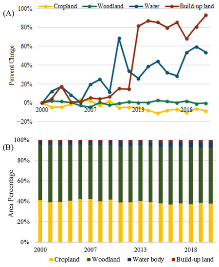 During the period 2000–2020, the study area generally showed a decrease in the area of cropland, a significant increase in the area of water bodies and built-up land and an almost constant area of woodland (Figure 5A). The changes were also consistent with the area percentage change in LULC composition (Figure 5B), where the area percentages of water bodies and built-up lands increased; however, that of cropland decreased.