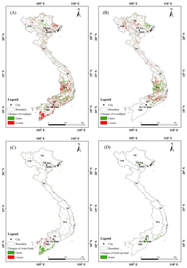 Spatial distributions of gains/losses of cropland (A), woodland (B), water body (C) and built-up land (D) during the period 2000–2020. Loss indicates that the land cover category was converted to other land cover categories, while gain shows that other land use types were transferred to the given land cover type from 2000 to 2020.