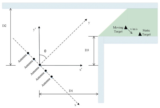 Since the direction of the radar and the wall are not perpendicular or parallel, in order to facilitate solving the target position, we constructed two coordinate systems: the radar coordinate system and the geodetic reference coordinate system. Both coordinate systems take the transmitting antenna as the coordinate origin. The geodetic coordinate system takes the parallel direction and the vertical direction to the intermediate interface as the x-axis and the y-axis, respectively. The radar coordinate system takes the line where the receiving antenna array is located as the x-axis and its vertical direction as the y-axis. These two coordinate systems can be converted into each other according to the radar angle.