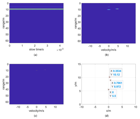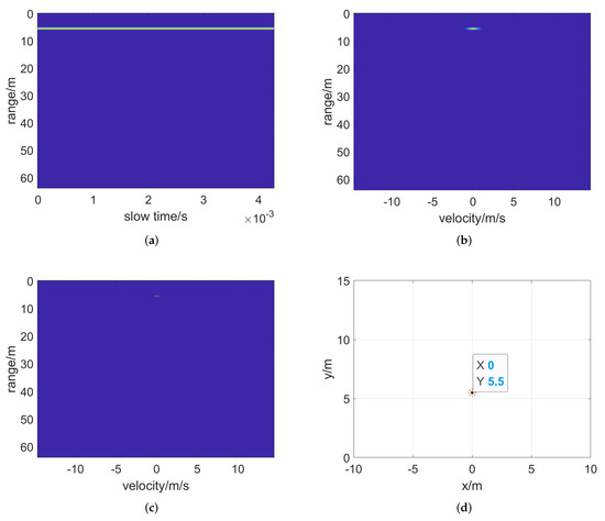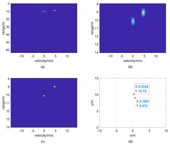 Target detection results of target echo. (a) Two–dimensional FFT, (b) range–gated result, (c) CFAR detection and (d) position of clustered target in radar coordinates.
