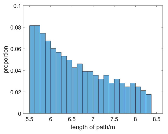 The path lengths of the echo signal of the target M are counted, and the path lengths distribution is shown in Figure 6. It can be seen that due to the multipath effect, the path length between 8.625 and 8.875 accounts for a relatively large portion. This length is greater than the direct distance between the radar and the mirrored target. In addition, the range resolution of the radar is 0.25 m. Therefore, the target distance estimated is slightly larger than the actual target distance.