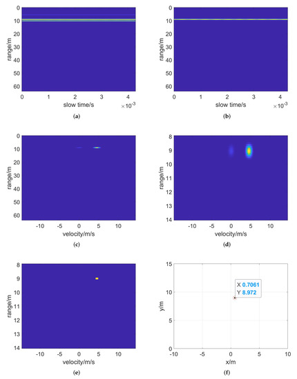 Detection results with two denoising operations for simulation echo. (a) Range FFT, (b) polynomial fitting denoise, (c) velocity FFT, (d) range–gated result, (e) CFAR detection and (f) target position in radar coordinates.
