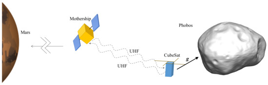 The proposed mission concept is designed to feasibly support the desired geodesy and the entire mission. NanoSats have started to play a role in planetary missions. As they are small and low-cost, they can be carried by a mother spacecraft and then deployed to perform audacious flight or landing, or cooperative operations along with the mother spacecraft. There have been several planetary NanoSat missions, such as Philae, MASCOT, MarCo, HERA-Juventas, HERA-Milani [24,25,26], and ideas (e.g., [23,27,28,29,30]). It is proposed in this paper that a CubeSat is carried and deployed by the mother spacecraft aimed for Phobos. The two probes will fly in different quasi-satellite orbits about Phobos, and perform inter-satellite Doppler measurements (see Section 2). The advantage is multiple-fold. First, the measurement is independent of the ground station and thus can support autonomous navigation, and consequently, enhance the safety of the main mission. Second, the longduration proximity orbiting will bear an evident signature of the geodetic characteristics of Phobos. As for feasibility, this paper analyzes budgets of volume, mass, power, deployment , and link, and the measurement noise of the system, and gives a detailed design of the CubeSat (see Section 3).
