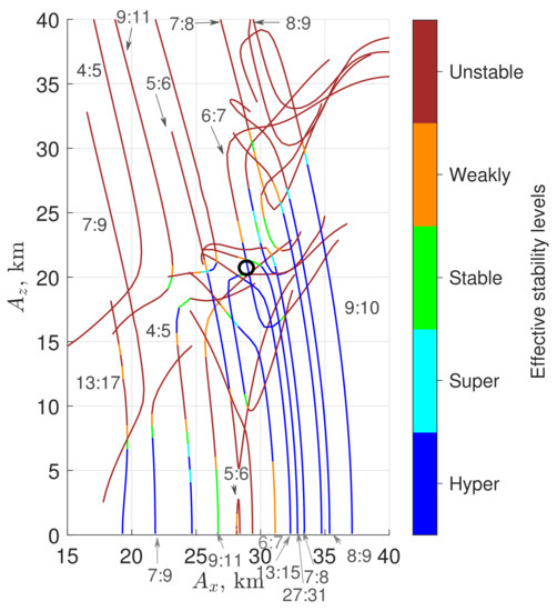 The irregularily shaped Phobos has dimensions of km. As it is much more smaller than Mars, whose dimension is 6780 km, and orbits closely (i.e., with a semi-major axis of 9377.2 km) around Mars, dynamics in its vicinity is dominated by the gravity of Mars. The sphere of influence of Phobos is small and even below its surface. Therefore, classical Keplerian orbits do not exist around Phobos. The retrograde quasi-satellite orbit (QSO) found in the Mars-Phobos three-body problem is a means for spacecraft to orbit around Phobos in the sense of relative motion [31,32]. Previous work has computed a database of periodic three-dimensional QSO (3D QSO) around Phobos in the circular-restricted three-body problem (CR3BP) [33,34]. Figure 2 presents families of periodic QSO described by the x-amplitude, , and z-amplitude, . The sensitivity of the orbits to the injection epoch, presumed ground-based orbit determination error (i.e., 1- 50 m and 3 cm/s on each component), and execution error (i.e., 1- 1.4 cm/s on each component) has been investigated by propagating the orbits for one week in the presence of the perturbations [34,35]. The color scale in the Figure 2 represents the effective stability of the QSO according to results of sensitivity analyses, which reveals the stability region of bounded orbits around Phobos. The super- and hyper-stable orbits can stay bounded for an acceptable duration (i.e., >7 days) in the high-fidelity model. Low-altitude orbits are generally sensitive to the gravity field of the target, and high-inclination orbits are particularly sensitive to the zonal gravity harmonics [16,22]. Therefore, a low-altitude and high-inclination 29 × 50 × 21 km (in format, where is the y-amplitude) 3D QSO, which is marked with a black circle and indicated hyper-stable in Figure 2 and shown to be easily maintainable in Refs. [34,36], is chosen as the candidate science orbit for the CubeSat. For the mothership, a high 100 × 200 km () planar QSO, which is safe from escape and impact, is adopted.