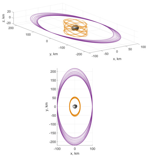 Owing to the small capacity of the micro-propulsion system, the cost for deploying the CubeSat from the orbit of the mothership to the low QSO should be low. Ikeda et al. [37] investigated the cost for transfers between QSOs around Phobos and robust injection points in terms of operational safety. They suggested that the injection be executed at leading and trailing points (i.e., at the y maximum and minimum in the rotating frame) of the QSOs and the intermediate “swing” QSOs. The swing QSO is the multi-revolution QSO with oscillating in the along-track direction of Phobos’ orbit, and connects low and high periodic QSOs. Figure 3 displays an example of a transfer from the 100 × 200 km QSO to the 29 × 46 km QSO in the Phobos-centered rotating frame with Mars on the axis. Note that the purpose here is simply to have an estimate of the deployment budget. Trajectories and are computed in the simplified CR3BP model. Three impulses are used in this example and all implemented at the leading or trailing points. The transfer is not particularly optimized, while the total is an affordable 16 m/s. To inject the CubeSat to the targeted 3D QSO, an out-of-plane around 3 m/s is required to incline the orbit. Therefore, the deployment requires a approximately at 20 m/s in total. For clear illustration, the shown transfer is the shortest case without revolving around Phobos, which is actually not practical in operation. As Ikeda et al. have noted, since the transfer arcs between QSOs belong to the swing QSOs that keep coming back to the same positions, can be implemented after several revolutions (preferably >2 days) to have a sufficiently long arc for orbit determination at an acceptable operation accuracy (for details, see Refs. [37,38]).