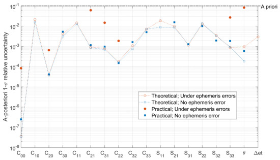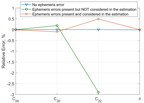 The estimation accuracies in two situations, one without ephemeris error and another one under ephemeris errors, are investigated. In this analysis, the mapping from the uncertain ephemeris error to is approximated by the mapping from the ephemeris time shift . The theoretical estimation accuracy achieved in one week is computed from Equation (5). The resulting relative uncertainty is presented in Figure 6. Note that, to show the relative uncertainties of the zero parameters, , , and , is adopted to represent their reference values. As is shown, the accuracies of , , and libration amplitude, , under the ephemeris error are as small as 0.04‰, 0.2‰, and 1‰, respectively. Nevertheless, as the estimation problem involves many uncertain variables and is highly-nonlinear, in practice, the numerical algorithm may not achieve this theoretical accuracy.