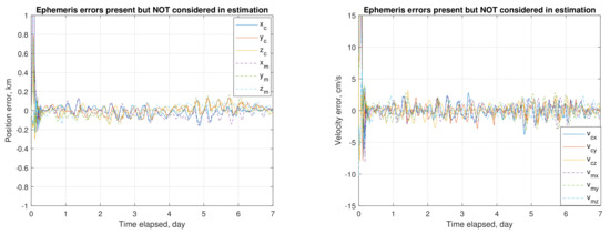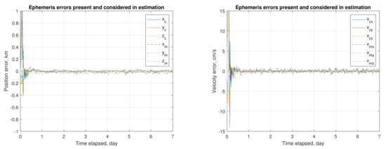 This subsection presents the estimation process for one sample of initial guesses, exhibiting the impact of ephemeris error, and the effect of mitigating this impact. The adopted sampled initial guesses and baseline values (i.e., the assumed true values) are listed in Table 5 for comparison. Note that the a priori and initial guesses of , , and are set to zero. The process of on-board autonomous navigation (or online orbit determination) under no ephemeris error (i.e., the mar097 ephemeris is employed in the estimation routine) is displayed in Figure 7. The estimation process converges and starts to follow new orbit states in one day. Upon convergence, the average root-sum-squared (RSS) position uncertainty is around 0.2 m, and the RSS velocity uncertainty is 0.05 mm/s. Figure 8 shows the process of online estimation in the presence of ephemeris errors (i.e., the ephemeris NOE-4-2020 is used). The RSS position uncertainty is significantly increased to 81.6 m, and the RSS velocity uncertainty to 1.63 cm/s. Considering the influence of ephemeris error on the estimation, an ephemeris time error is taken as a consider parameter [49]. Figure 9 shows the estimation process considering the ephemeris time error. The RSS position uncertainty is substantially improved to 20.7 m, and the RSS velocity uncertainty to 0.4 cm/s.