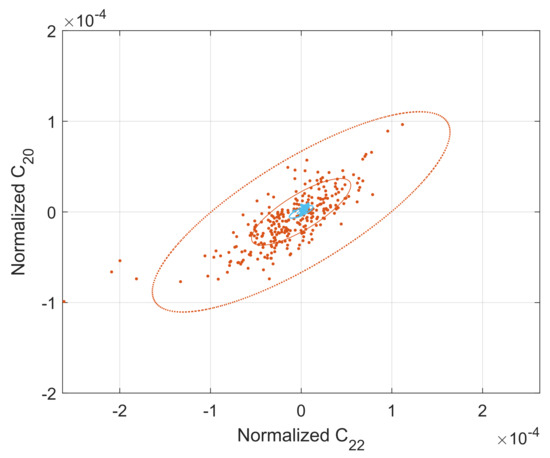 The Monte-Carlo simulation is performed to derive a statistical conclusion. Two situations are considered. One situation is without ephemeris error. Tho other is under ephemeris errors, and the ephemeris error is considered in the estimation. For each situation, 290 simulations starting with the 290 errored samples of uncertain variables are run. Statistical covariance of the gravity coefficients is concluded from differences of the estimates from the true values. The obtained standard deviation is presented in Table 6. The impact of ephemeris errors on geodesy is clearly observed from the differences. Nevertheless, even in the presence of the ephemeris error of 2 km, by considering an ephemeris time error in the estimation, the uncertainty of can be kept down to 0.08‰, which is better than the latest implications (e.g., 0.3%, [10]; 0.04%, [15]) from flyby tracking data, suggesting an advanced effectiveness of the proposed dual-sat radiometric observation. The influence of ephemeris error on 2nd-degree gravity identification is around 0.6‰ for and 1.7‰ for . The 1- uncertainties of and are hundreds of times smaller than that derived from past flyby tracking data (i.e., 8% and 30%, [15]). The libration amplitude , however, becomes almost unobservable under the ephemeris error, as the obtained accuracy is just slightly better that the a priori, 10%. Errors of and are plotted in Figure 11, along with the concluded covariance ellipses.