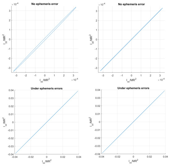 The previous subsection has deduced from the statistical result. The covariance of MoI is computed from Equation (14) and depicted in Figure 12. When there is no ephemeris error, the accuracy of MoI is as good as (i.e., 0.9‰). When the ephemeris error is present, the 1- uncertainty of each normalized MoI is around 0.04 (i.e., 10%), mainly contributed by the error. This resolution of MoI cannot directly distinguish families of the interior structure. However, according to Le Maistre et al. [9], the MoI distributions of heavily-fractured and porous-compressed families behave in an opposite way (for details, see Figure 8 of Ref. [9]). Therefore, the near-proportional error distribution exhibited in Figure 12 can distinguish these two families of interior structures.