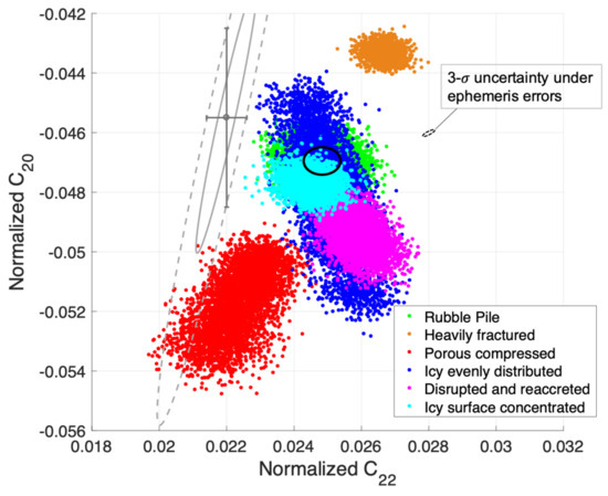 Le Maistre et al. [9] also computed the distribution of different structure families over and . The uncertainty ellipse in Figure 11 is placed on the distribution map from Ref. [9], which is shown in Figure 13. Because of the comparably tiny sizes of the uncertainties obtained in this work, only the 3- uncertainty ellipse under ephemeris errors is shown. Errors of the estimated and are constrained in this ellipse for the ephemeris error up to 2 km. Given this comparably tiny margin, we can separate the possibility of heavily fractured, porous compressed, and the families in the middle of the map, and distinguish the disrupted-and-reaccreted family from the icy-surface-concentrated and rubble-pile families, regardless of the true values of the parameters.