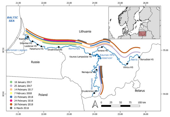 According to ground observations in 2018, ice started to form in the analyzed rivers on 6–7 February. Border ice stayed in the majority of river sections until the 26 February. At the same time, sparse and dense frazil ice appeared for short periods. The Nemunas Delta Region River was covered with consolidated ice from the 11 February until the second week of March.