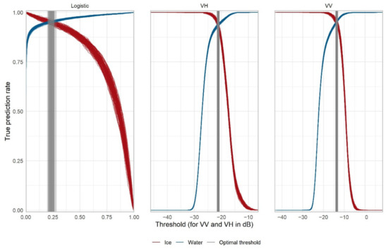 To use SAR backscatter values in binary classification, the threshold dividing the ice and water classes must be estimated. In this study, we determined the optimal threshold for the classification models based on VV and VH polarization backscatter, as well as the logistic model, using the sensitivity and specificity (true negative rate) of classification with different threshold values. The sensitivity (true positive rate) in our case corresponds to the ratio of correctly identified ice, and the specificity (true negative rate) shows correctly detected water. The aim is to develop a classification model for the correct identification of both ice and water. Thus, the optimal threshold value for a classification is where the specificity and sensitivity are equal (Figure 4). We tested the stability of all three classification models threshold value using the same 100 subsets of training data used to analyze the variability of the logistic model parameters. The sensitivity and specificity of the logistic classification model were calculated using 100 logistic models fitted to a particular subsample of data.