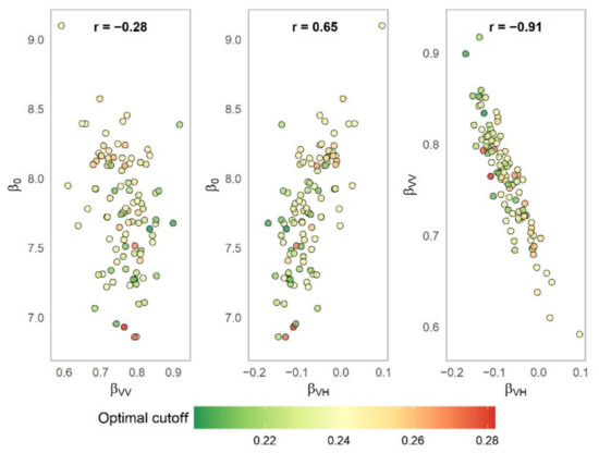 The model parameters βVV and βVH were highly correlated in models fitted to 100 training data subsets (Figure 5). These parameters were linearly combined in the logistic model Equation (1), and the increase of the βVV parameter compensated the decrease of the βVH parameter. There was also a strong positive correlation between the β0, and βVH parameters (Figure 5). The optimal threshold value of the analyzed models had no clear link to the combinations of logistic model parameters. High and low threshold values were scattered in the parameter space without clear patterns (Figure 5), showing that the reduction of degrees of freedom is not likely to significantly affect the variability of optimal threshold values.