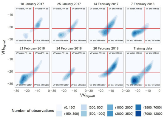 The difference between the backscatter from Sen2Cor water and ice class pixels was high in both VV and VH polarizations (Figure 2). In the training dataset, the 0.1 quantile of backscatter intensity from ice pixels was −12.4 dB for VV polarization and −20.6 dB for VH polarization, and the 0.9 quantile of backscatter intensity from water pixels was −16.7 dB and −23.2 for VV and VH polarizations, respectively. The difference between the medians of backscatter in ice and water pixels was 12.9 dB in the case of VV polarization and 9.7 dB in the case of VH polarization, showing that the differentiation between backscatter values was smaller in VH polarization than in VV polarization.