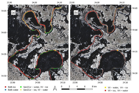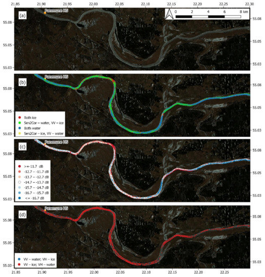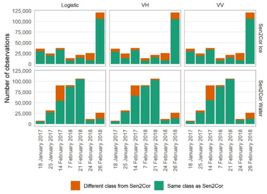 The agreement of Sen2Cor classification with VH classification was better than with VV or logistic classification (Figure 7) on 14 February 2017. Many pixels were assigned to the water class by the VH model, while these pixels were assigned to the ice class by the VV model (Figure 11d). These differences between SAR-based VV and VH model results were in the same areas where Sen2Cor predicted water.