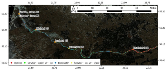 The fraction of pixels in which Sen2Cor and SAR-based methods assigned same classes was the smallest on 24 February 2018 (Table 3), but the largest number of pixels with mismatched classes occurred on 14 February 2017 (Figure 7). On 14 February 2017, we overlapped satellite data acquired for the Nemunas River downstream from the Kaunas HPS Reservoir and for a 70 km long section of the Neris River upstream from its mouth (Figure 1). According to ground observations, the Nemunas River was covered with consolidated ice in all hydrological stations downstream from the Smalininkai HS (111 km from mouth). Visual analysis of Sentinel-2 images revealed that consolidated ice or dense ice rafts were in the 175 km river section from the river mouth. Sen2Cor assigned most pixels in this section of the river to the open water class (Figure 10).