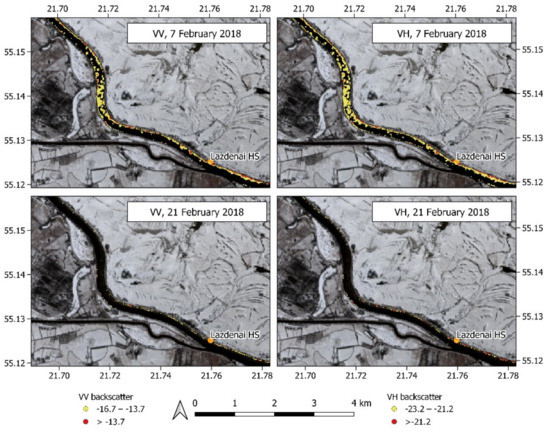 Sentinel-1 SAR backscatter in VV and VH polarizations in Nemunas River near the Lazdenai HS on a day with sparse frazil ice (7 February 2018) and without frazil ice (21 February 2018).