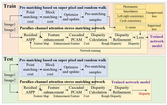 In this section, we present the proposed self-supervised stereo matching approach in detail, and the outline of our approach is given in Figure 1. Our self-supervised method is divided into two stages: training and testing. In the training stage, some labeled samples with high confidence are obtained through the proposed pre-matching method, which is then used to train the parallax-channel attention stereo matching network. After the net-work model is trained, the model is used to test the stereo images one by one in the testing stage to obtain the disparity map and stereo matching relationship. Therefore, the pre-matching method and the parallax-channel attention network during the training stage are the core of this paper and will be introduced in detail in this section.