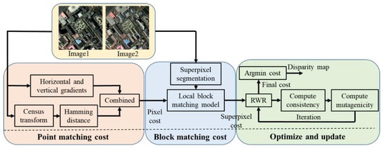 Based on the above ideas, this paper proposes a pre-matching method based on superpixel random walk, and the outline of the pre-matching is given in Figure 2. Using the constraint relationship between optical image and disparity image, the noise results in weak texture, and the mismatch of occlusion or parallax abrupt change region are removed by superpixel segmentation and two constraint criteria. Specifically, we first construct a point matching cost using selected simple features. Then, we aggregate them into block matching cost based on the superpixel segmentation results. Finally, the matching cost is updated and optimized according to the two constraint criteria of parallax consistency and mutation, so as to obtain some stable matching points. The method consists of three steps: constructing the point matching cost, constructing the block matching cost, and optimizing and updating the cost.