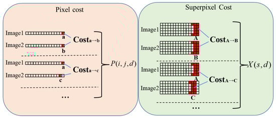 where is the edge weight, is the consistency constraint, is the current disparity of the neighboring superpixel, and is the temporary disparity value of the u-th superpixel. The mutability matching cost is calculated using the temporary disparity values composed of all superpixel blocks, as in Equation (12).