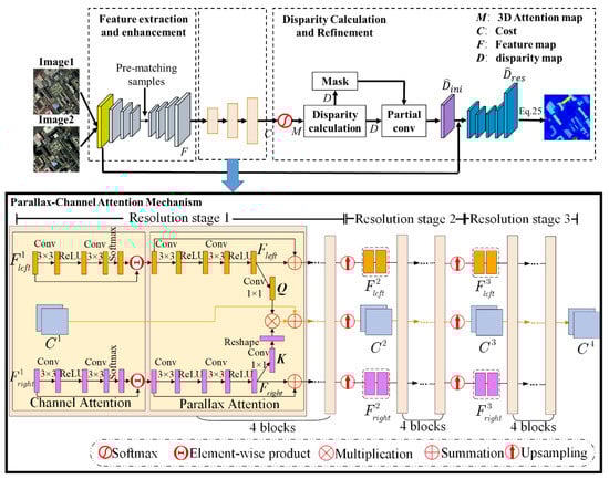 Architecture overview of proposed stereo matching network based on parallax-channel attention mechanism.