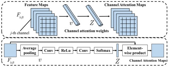 The image features extracted using residual atrous spatial pyramid pooling contain multiple channels. Parallax attention only considers the spatial features of the image features, equivalently treating each channel of the features and ignoring the differences between the different channels. For this reason, we use a channel attention mechanism [] that applies feature weighting to the different channels of the extracted features and . It models the importance of each feature channel and then enhances or suppresses different channels, so that the channels that are more favorable for matching accuracy improvement receive more attention and further improve the matching effect. Since each channel describes different semantic information of the image, applying the attention mechanism in the channel can be regarded as a process of selecting semantic attributes. The illustration of channel attention mechanism is given in Figure 7.