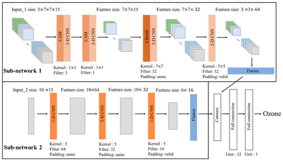 A schematic diagram and the specific parameter settings of our model are shown in Figure 2. For sub-network 1, the input is a 4-D matrix, as mentioned above. We first applied a combination of CAM and 2-D CNN to the inputs, and 2-D CNN with 1 × 1 kernel size was applied to each variable, calculating the temporal dimension. The 1 × 1 convolution kernel, also known as network-in-network, is used for cross-dimension information interaction. Here, this algorithm was used for the aggregated temporal information. The temporal feature map of each variable was obtained through two combination layers, and the calculated feature size was 7 × 7 × 15. Then, a CBAM and 2-D CNN with 7 × 7 convolution kernel size were applied to this feature, aiming to extract the spatial and channel (the information between different variables) features, and finally a feature map was obtained with a size of 3 × 3 × 64. This sub-network represents a low-cost and crude way to process temporal information while focusing on extracting spatial and channel information. For sub-network 2, three layers of 1-D CNN were applied to 10-day time-series inputs, obtaining a 6 × 16 feature map. This sub-network worked to extract long-term temporal features. In the end, the features extracted from the two sub-networks were flattened into a 1-D vector and connected, then passed into two fully connected layers for regression. In brief, the model can be summed up as follows: