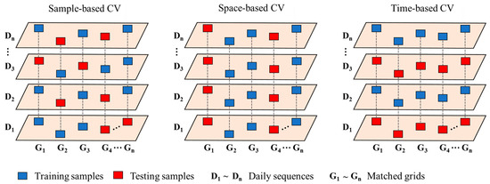 We adopted a 10-fold cross-validation (CV) strategy to validate model performance. To test the overall fit, the widely adopted sample-based CV was selected [14,20,39]. In sample-based CV, all matched samples are randomly divided 10-fold, of which 9 folds are used for model training, and the rest are used for validation. This process is repeated 10 times to ensure that all samples are tested. To test spatiotemporal predictive ability, we adopted space-based and time-based CV, whose operations are similar to sample-based CV, but the sample division criteria are spatial grid (0.05°) and DOY (day of year), respectively [59]. A schematic diagram of the 3 CV methods is shown in Figure 3.