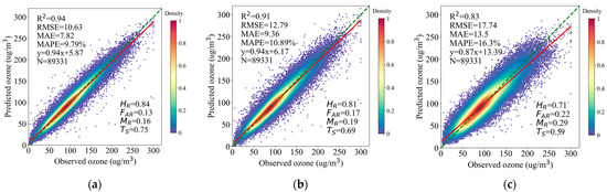 Figure 4 displays the results of the three CV methods. The CV-R2 (CV-RMSE) values of sample-based (Figure 4a), space-based (Figure 4b), and time-based (Figure 4c) CV were 0.94 (10.26 ug/m3), 0.91 (12.79 ug/m3), and 0.83 (17.74 ug/m3), respectively. The results indicate that the ozone estimations of our model are highly consistent with ground-level measurements. Note that compared with sample-based CV, the performance of space-based and time-based CV had a certain decline. This problem is widespread in machine learning based air pollution modeling, mainly because of the unsatisfactory generalization performance of data-driven models. However, our model’s spatiotemporal prediction ability reached an acceptable level, and statistically surpassed some recent studies. The Ts (HR) values of sample-based, space-based, and time-based CV were 0.76 (0.85), 0.69 (0.81), and 0.59 (0.71), respectively, indicating the model has good ability to predict peaks, which is important for air pollution studies, especially when assessing human exposure levels.