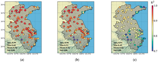 R2 value of sites in (a) sample-based CV, (b) space-based CV, and (c) time-based CV.
