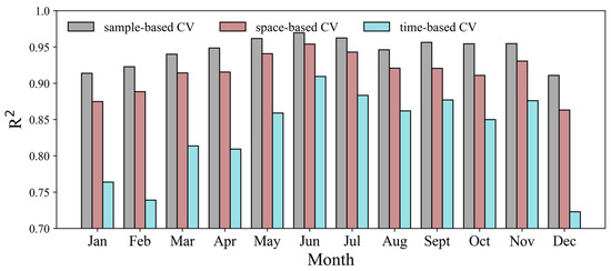The spatial distributions of R2 values of the three CV methods are shown in Figure 5. In sample-based (Figure 5a) and space-based CV (Figure 5b), sites with R2 values greater than 0.9 accounted for ~86 and ~80%, respectively. In time-based CV (Figure 5c), R2 values exceeded 0.8 at ~80% of sites. The performance of our model was relatively poor in the southwest mountainous and northeast coastal areas, mainly because of the sparse distribution of monitoring sites in these regions. On the individual month level (Figure 6), the model performed best in summer and worst in winter. The R2 values ranged from 0.91 to 0.97 in sample-based CV and from 0.86 to 0.95 in space-based CV. In time-based CV, the model performance fluctuated more, and the R2 value was highest in June (0.90) and lowest in December (0.72). In general, there was no obvious spatiotemporal nonstationarity in our model’s performance; no exceptionally low R2 values were shown in the three CV methods for each site and month. In addition, the mountainous and northeastern coastal areas are relatively sparsely populated, and summer is often the season with the highest ozone concentration, which further reduces the disadvantage of our model for environmental research.