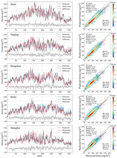 To further investigate the spatial predictive ability of our model, we evaluated the model performance for 5 major cities, 4 provincial capital cities (Jinan, Nanjing, Hangzhou, and Hefei), and Shanghai. The sites in these cities did not participate in the model training process, and the mean values of all site observations/model predictions in each city were used as city-level ozone concentrations. The geographical locations of the 5 cities are shown in Figure S4.