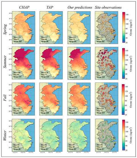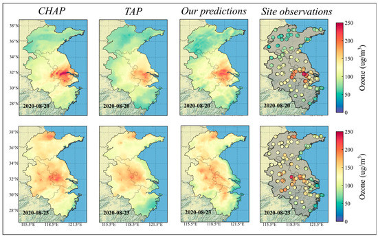 We generated the daily ozone data grid for 2020 by using the optimal model in sample-based CV, and the fitting results are shown in Figure S7. Two published datasets, China High Air Pollutants (CHAP) and Tracking Air Pollution in China (TAP), were selected to contrast the consistency. CHAP ozone was estimated based on the spatiotemporal extremely randomized trees model, the performance of which in eastern China (sample-based R2 = 0.93) is similar to our results (sample-based R2 = 0.94) [60]. TAP ozone was generated using a chemical transport model and the data fusion method with R2 equal to 0.7 nationwide [61]. First, the quarterly averages (Figure 8) showed a high degree of consistency between our data, CHAP, TAP, and site observations (the errors of daily averages can be seen in Figure 9), and the predicted ozone showed coherent spatial distribution without visible boundaries caused by model overfitting, which confirms the reasonability of our results. Second, daily comparisons (Figure 10) showed that our data have mainly two advantages: (i) there were no obvious interpolation centers, and the predictions in locations of monitoring sites were more consistent with the surrounding data; and (ii) more detail on ozone distributions was provided due to the higher spatial resolution.