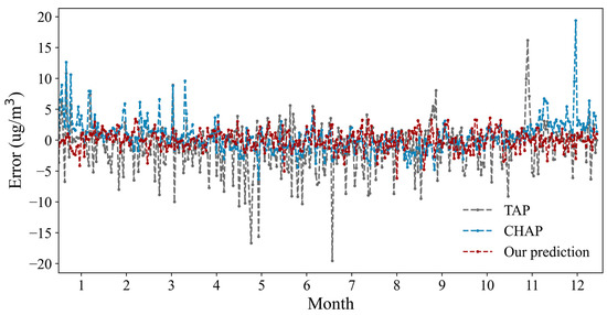 The time-series diagram (Figure 7) shows that the model’s predictions were in good agreement with observations in all cities. For Jinan, Nanjing, Hangzhou, Hefei, and Shanghai, the R2 values were 0.89, 0.87, 0.84, 0.83, and 0.83, and the RMSE values predicted by our model were 18.25, 16.62, 13.84, 19.09, and 16.07 ug/m3, respectively. The Jinan area had the lowest MAPE of 17.12% and the Hefei area had the highest MAPE of 23.18%, but the performance was still very good. The results indicate that our model can provide robust spatial interpolation predictions.