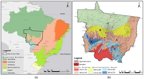 Study area: (a) Location of Mato Grosso state in Brazil and biomes map; (b) Agroclimatic maps of Mato Grosso state established in a previous study []; Cropland extent in 2017 is indicated in grey mapped by Camara et al. [], and the ground samples are indicated in red (2018/2019).