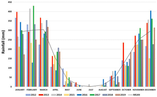 The predominant climate types are tropical, super-humid monsoon climate (with an annual average of 2000 mm) and tropical climate (with summer rains and dry winters with precipitation above the annual average of 1500 mm []). It still has an interannual climate variability (Figure 2) due to the phenomena of the South Atlantic Convergence Zone (SACZ), the Intertropical Convergence Zone (ITCZ) and the “ENSO” (El-Niño—Southern Oscillation) phenomena.
