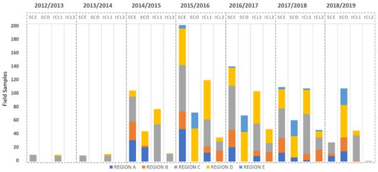 Spatio-temporal distribution of field samples by the four main classes according to each crop year and agro-climatic regions.