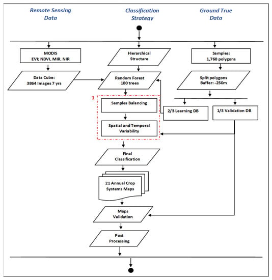 Flowchart presenting the main classification strategy issues. 1 Methodological issues: Samples balancing strategy assessment; Spatial variability assessment; Temporal variability assessment.