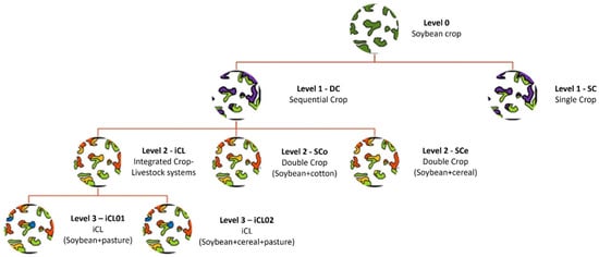 Level 3: The integrated Soybean+Pasture class is separated into two classes: Soybean+Pasture (iCL1) and Soybean+Pasture in association with cereals (iCL2).