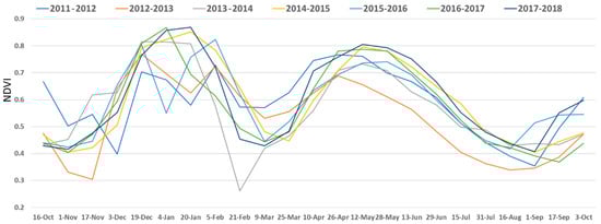 Inter-annual variability of the mean NDVI time series of the iCL class samples over Mato Grosso, for seven agricultural campaigns: 2012/2013, 2013/2014, 2014/15, 2015/16 (ENSO), 2016/17, 2017/18 and 2018/19 (ENSO).