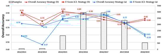 Overall accuracy and F-score of the iCL class obtained for each year and for the two temporal sampling strategies is shown in the top part; the number of samples (given in pixels) available per year is represented by the histograms in the lower part of the figure.
