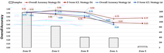 Analysis Figure 10 allows the assessment of the impact of the spatial sampling strategy on the overall accuracy of the map and on the F-score of the iCL class. We observed that the larger the number of samples in the region is, the higher the overall accuracy and the F-score, both for training strategy (a), with regional samples, and for training strategy (b), with global pooled samples. The overall accuracy and F-score values in zones B, C and D are close for both strategies. In zone A, when all years are used for training (dataset b), there is a significant improvement in the overall accuracy. Following the pattern of the previous test, the results suggest that the classification accuracy is more related to the number of samples for training than to the climatic variability present in the different regions of the state.