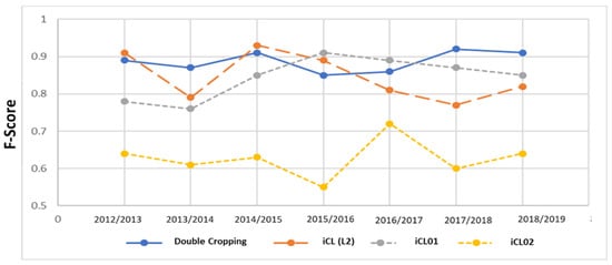 The results show that the double cropping system Soybean+Cotton (SCo) is classified with a very high accuracy, whatever the training strategy, while the F-Score of the Soybean+Cereals (SCe) class is between 0.65 for Bset3 and 0.96 for Bset1. The best F-scores for the iCL class were obtained for Bset01 and Bset02 (0.81 and 0.83, respectively), but with a higher commission error for Bset01 (+9%).